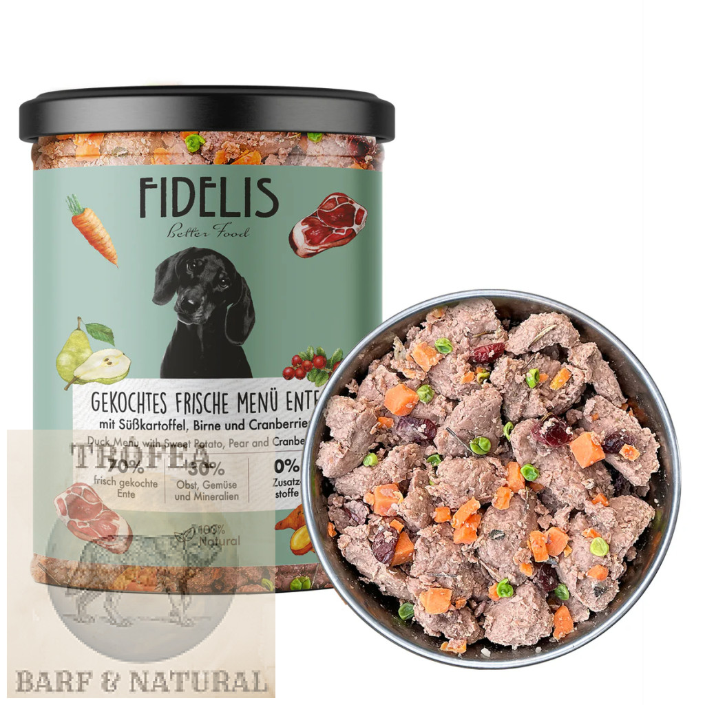 A Fidelis csak friss, élelmiszer-minőségű alapanyagokat használ a friss kacsa menühöz. A kiváló minőségű kacsahúst és belsőségeket lassan és kíméletesen főzik alacsony hőmérsékleten. Csak ezután adják a főtt ételhez a blansírozott édesburgonyát, sárgarépát, borsót, körtét és áfonyát, valamint lenolajat, csipkebogyót, lime-algat, sörélesztőt, hínárlisztet és rozmaringot. Ez biztosítja az íz és a tápanyagok optimális megőrzését.